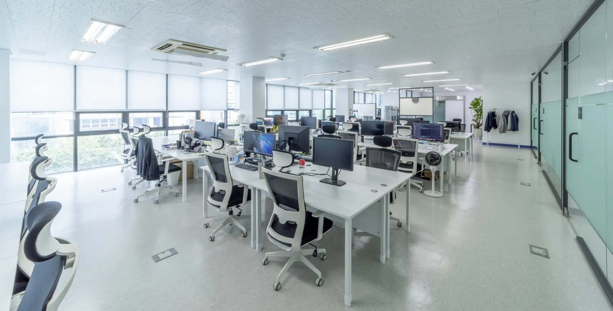 화이트톤의 인테리어와 전면 유리창에서 들어오는 햇살이 반겨 줘서 늘 밝고 아늑한 사무실 전체 모습이에요.